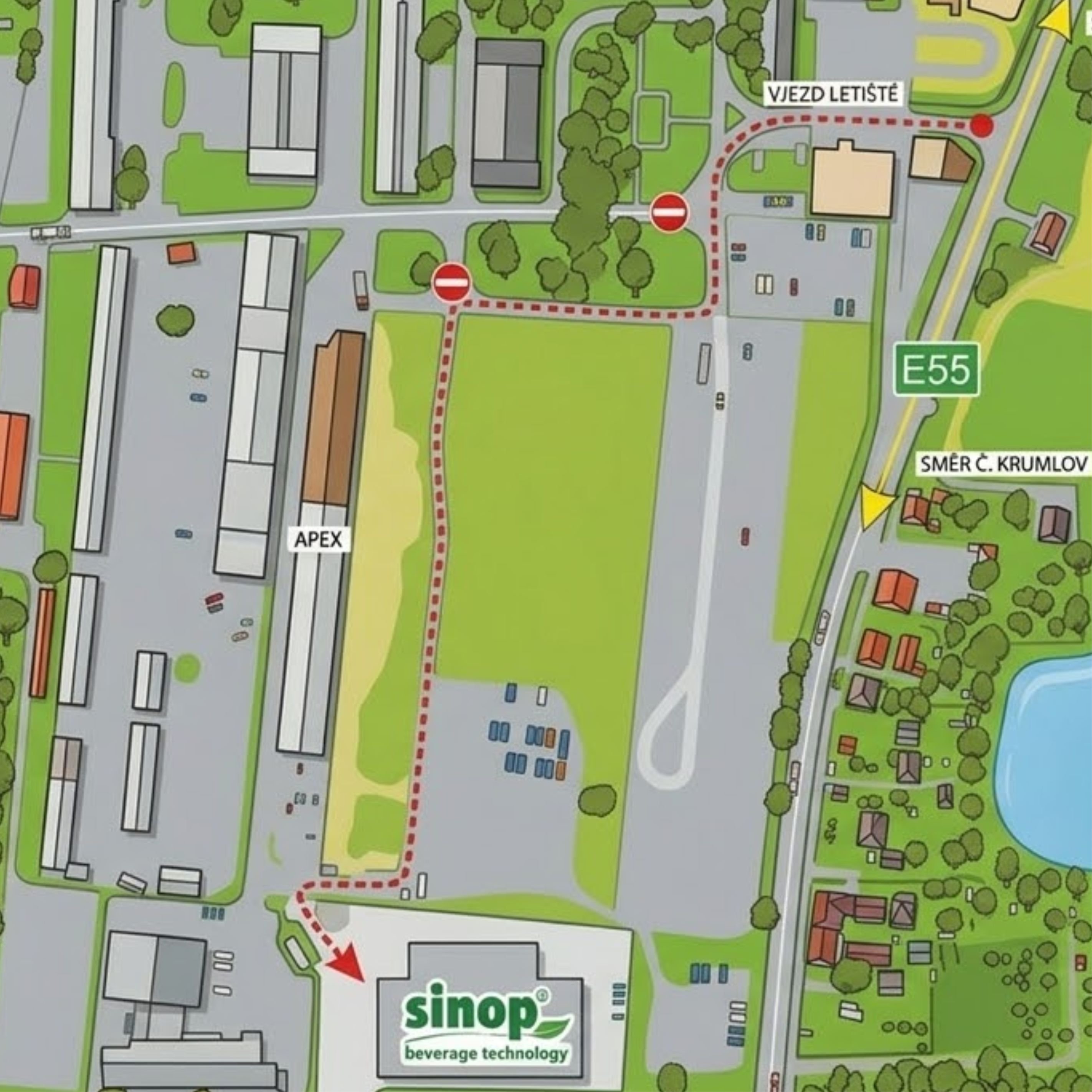 Vážení zákazníci, z důvodu stavebních úprav areálu letiště České Budějovice bude dočasně od 28.3.2026 po dobu cca jednoho měsíce, nutné použít provizorní objízdnou cestu do našeho závodu SINOP BT - Planá 95. Cesta vyznačena na plánku níže: